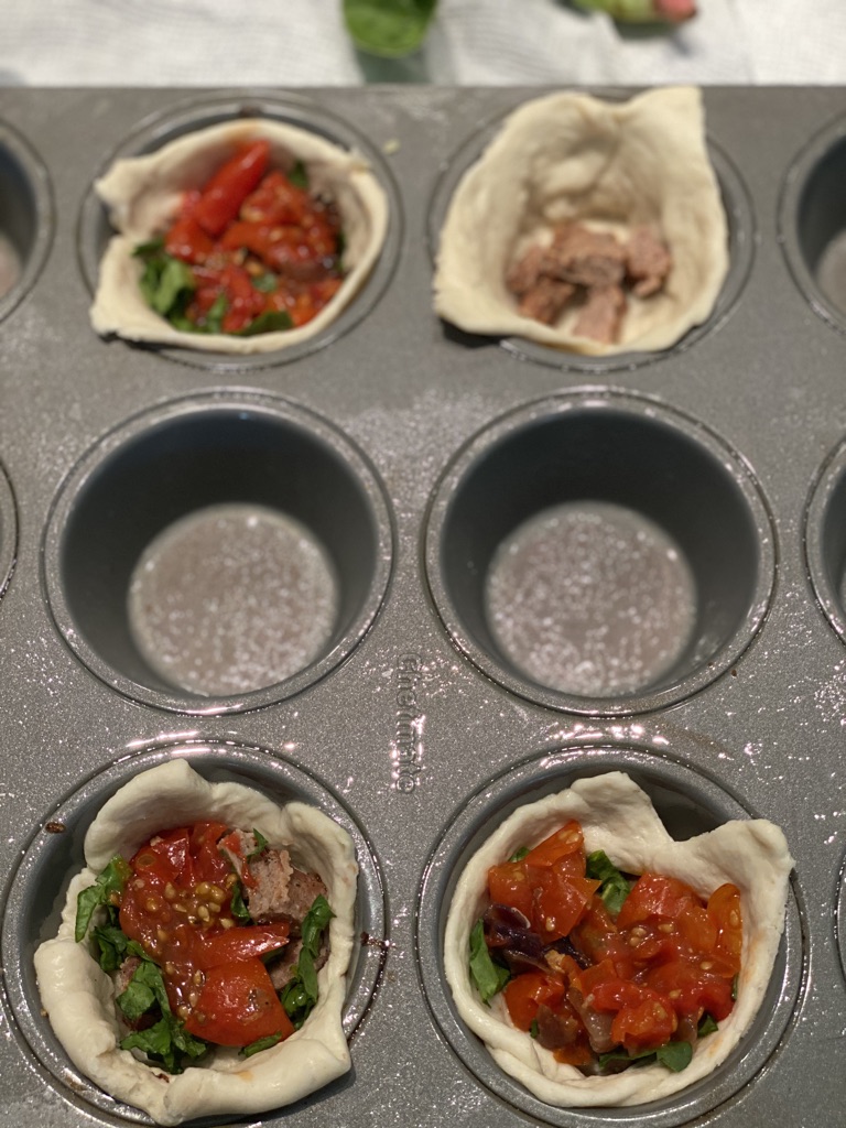 Take out your croissants and roll them out, stretch them out as long and wide as you can, then seal the seams by pinching them and pressing them. Cut your dough into 4 squares. Stretch the square a bit before placing it into a sprayed muffin tin. Repeat until all of the dough is in the muffin tin.
