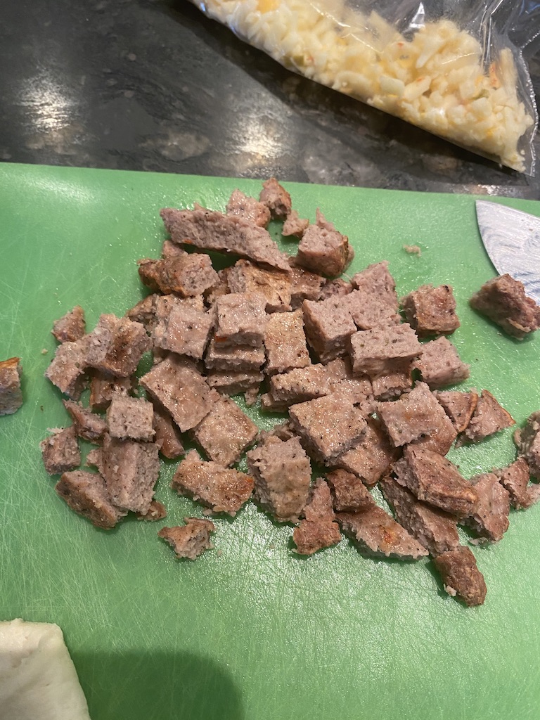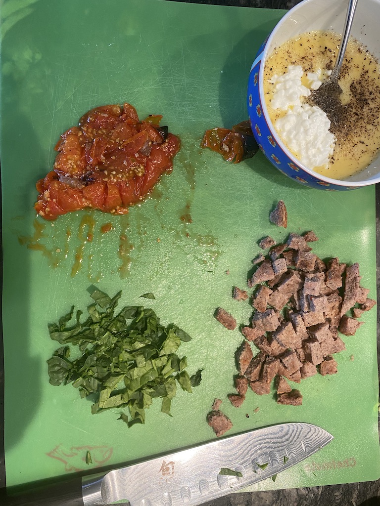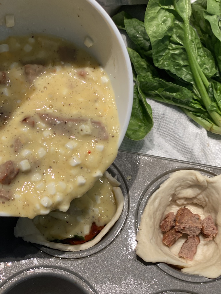 Place your add-ins inside each dough. You can customize them for different palates. Pour the egg mixture into each dough and use a fork to move the add-ins around making sure the egg has gotten all over the add-ins.