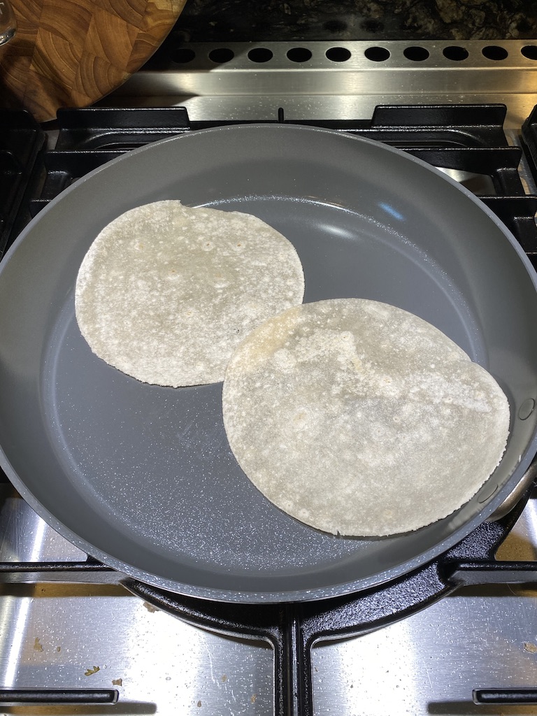 In a large skillet, heat the tortillas. If using the Siete grain free brand, you will cook the tortillas on both sides. While the second side is heating, sprinkle the gruyere and Swiss cheese and add the ground beef. Once the cheese starts to melt, start rolling the tortilla to wrap it all up. Be careful, the tortilla will be very hot. Use a spatula to help get them turned over. To crisp up the sides, place a heated smaller skillet or a weighted tool on top just for a minute or two. Flip it over for the second side to get crispy. Using a spatula, remove the roll-ups to a lined cookie or baking sheet to keep warm in the oven. When you’ve made all of the ground beef ones, switch to the chicken.