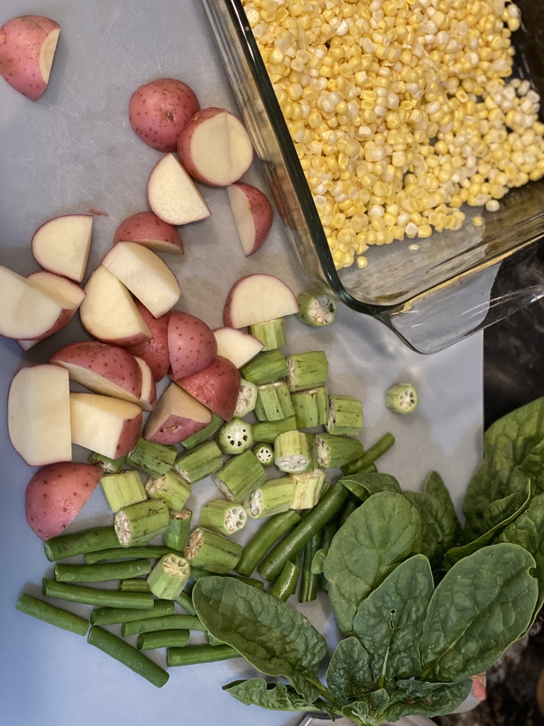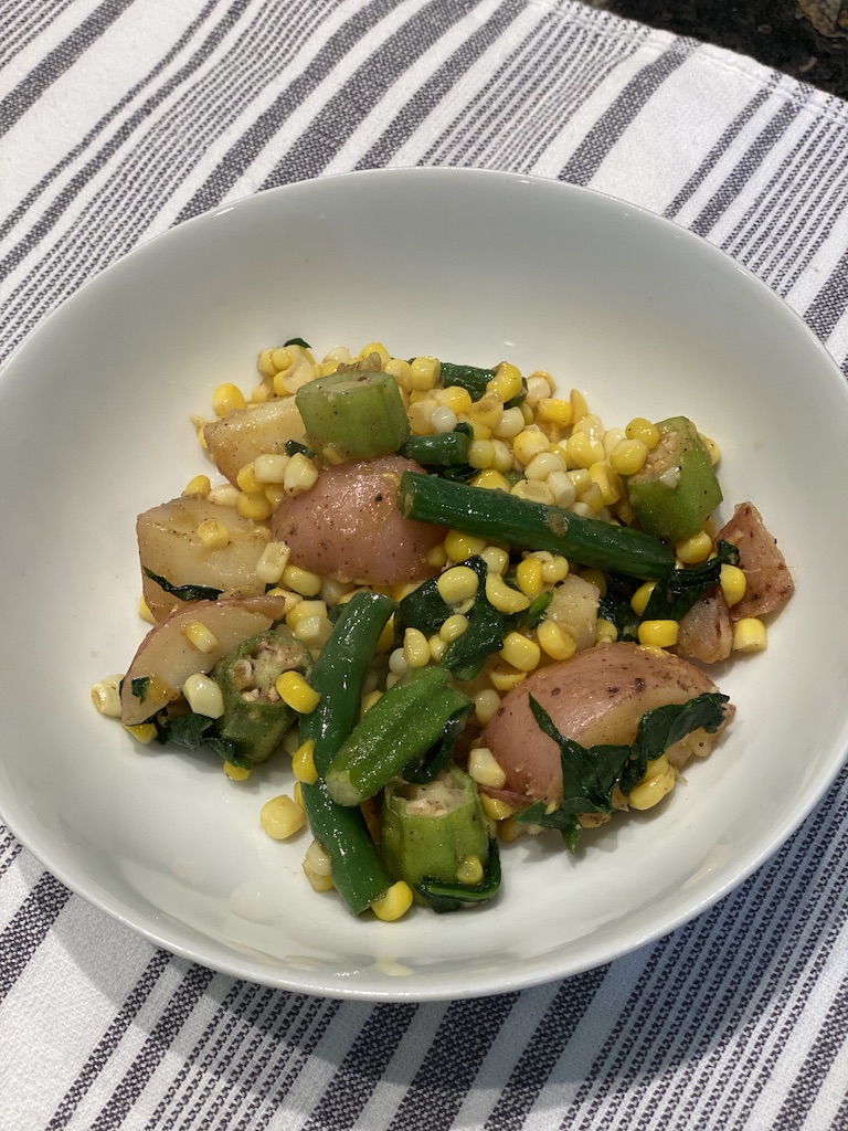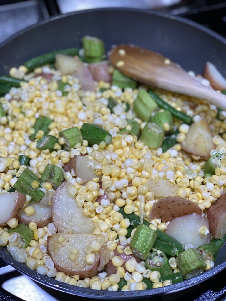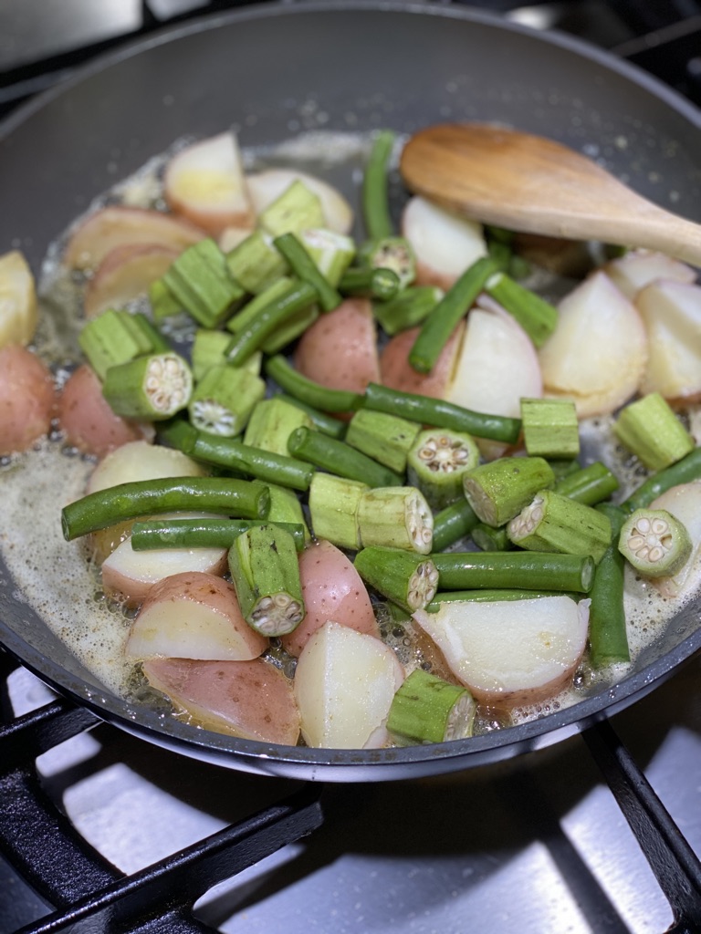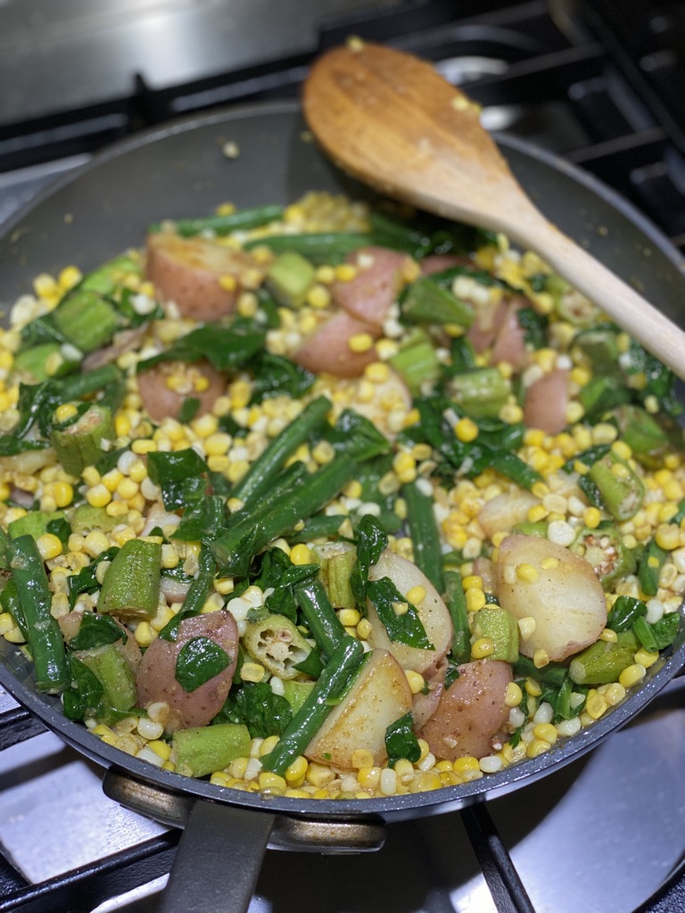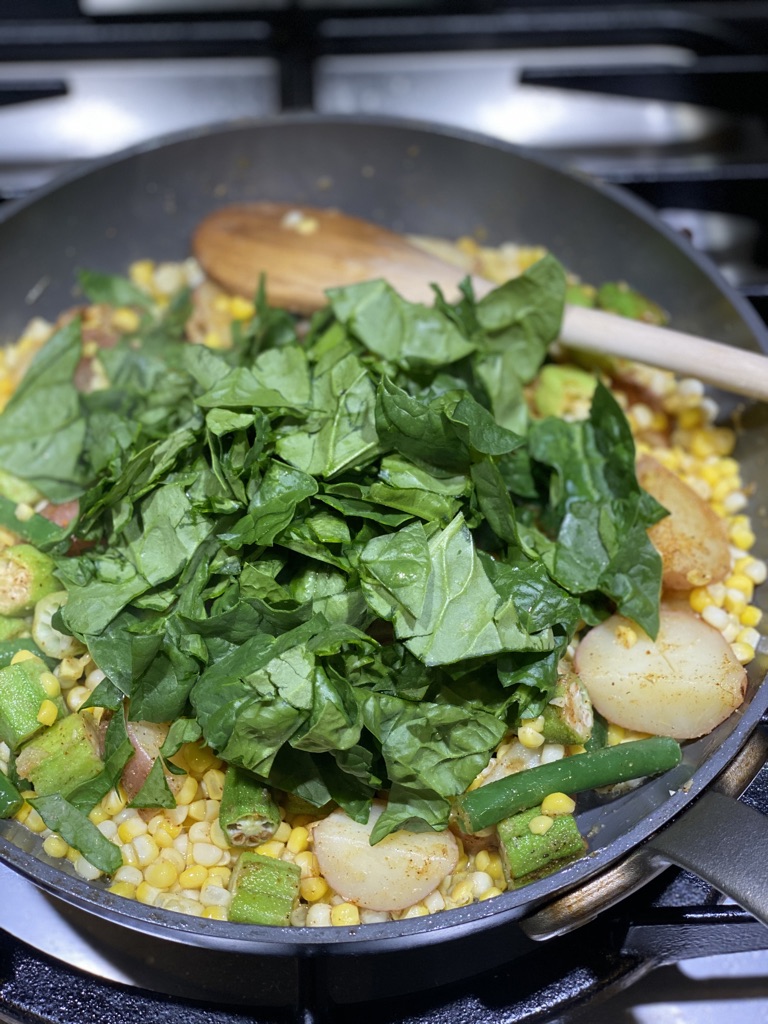 In a medium skillet melt the butter or ghee or heat up the broth. Add the new potatoes and let cook for 2 minutes to get some color on them. Add the washed and cut up okra and green beans. Give it a stir and let all of the okra and green beans cook. Add the corn and stir. Sprinkle on the Creole seasoning and stir. Add the spinach and stir, cooking until the spinach is wilted. Continue cooking until everything is hot and the flavors are well blended.